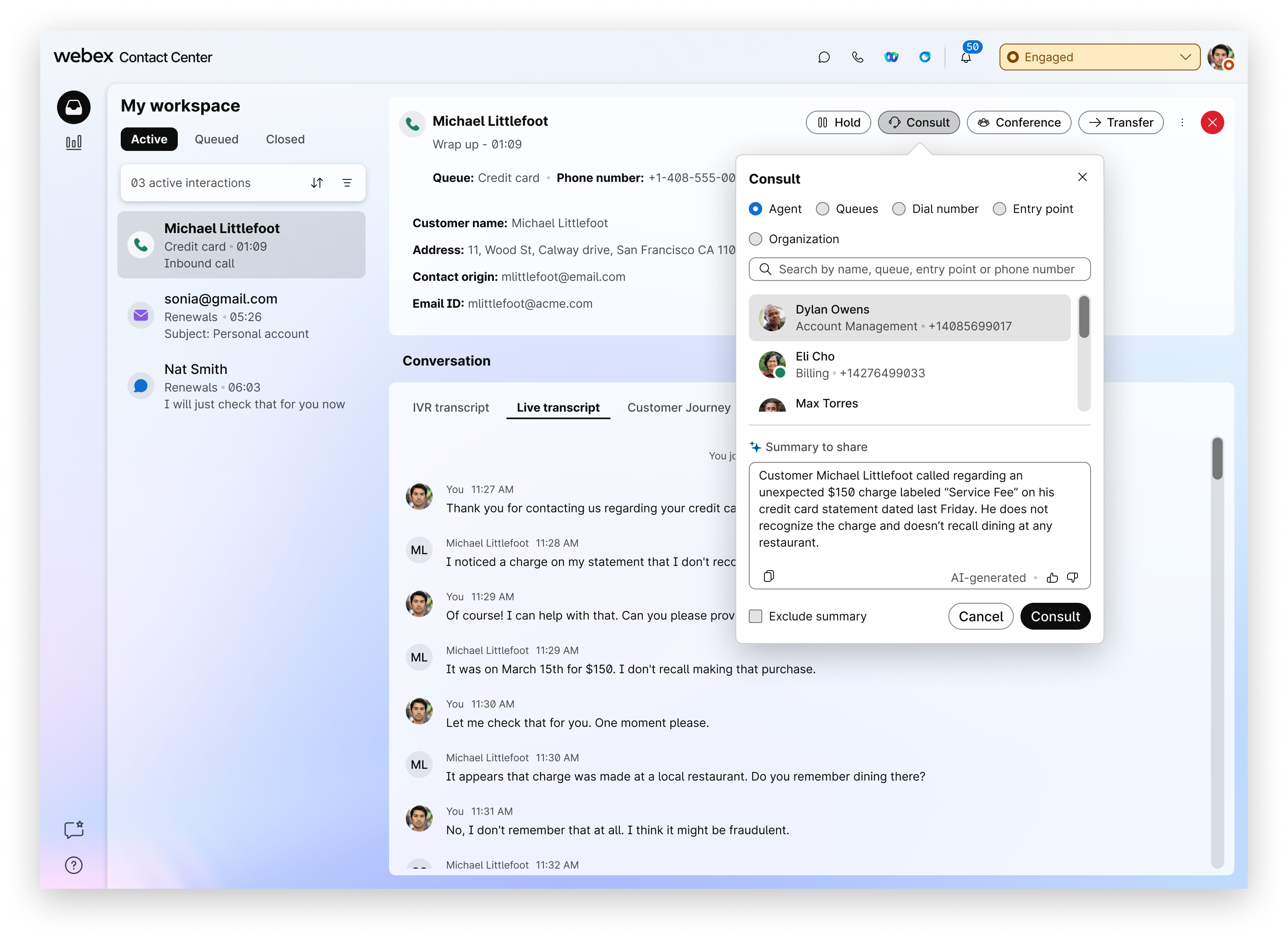 Consult and transfer (mid-call) summaries: An AI-generated summary of the conversation so far, provided when you consult or transfer a call—documenting customer interactions by hand can be time-intensive and sometimes results in important details being overlooked.