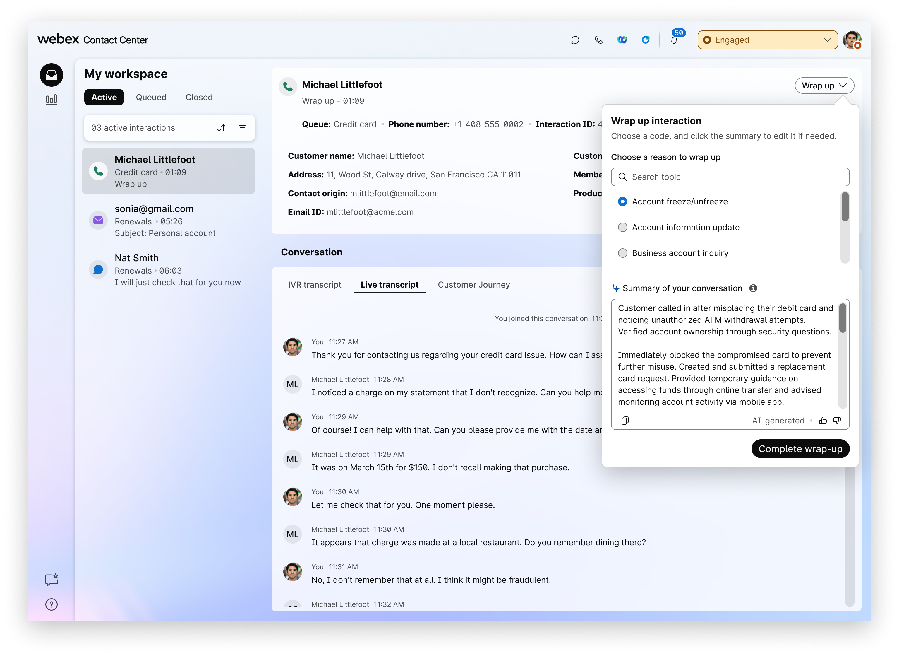 Accept an incoming voice call or initiate an outbound voice call. The AI Assistant notification will appear in your desktop interface. For voice calls, conversations are transcribed in real time in the Live Transcript tab. For more information, see Enhance efficiency and communication with real-time transcripts. |