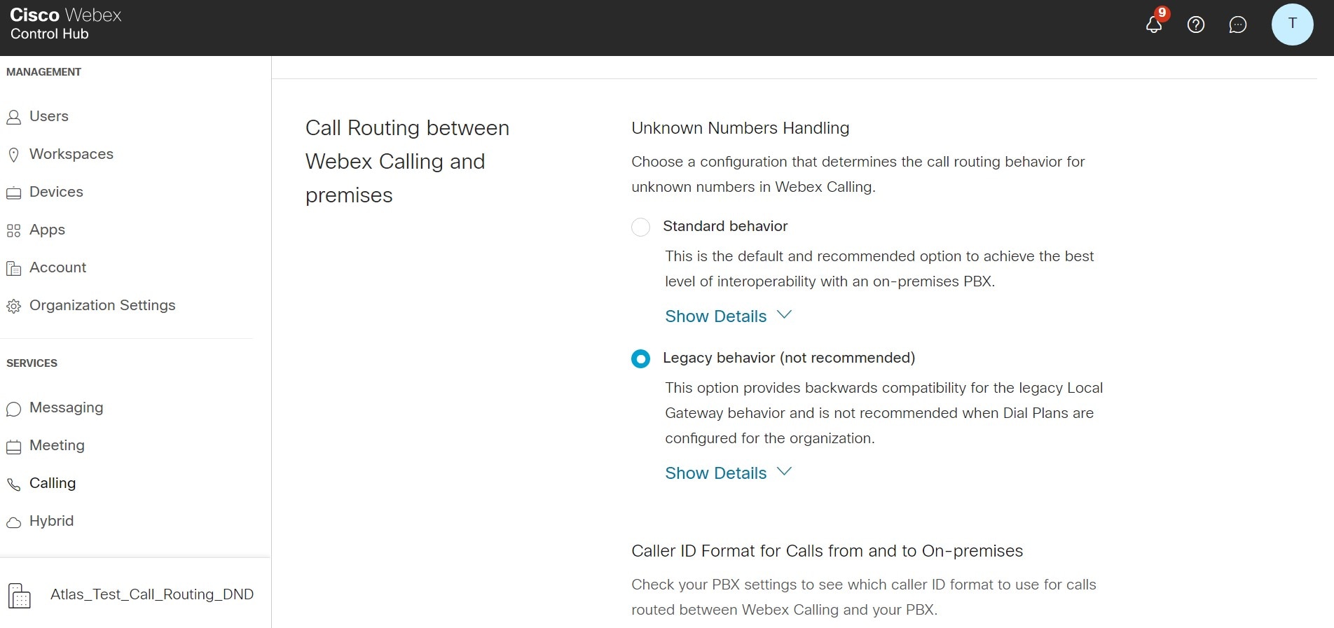 I Control Hub kan du konfigurere indstillinger for viderestilling af opkald mellem Webex Calling og steder. Disse indstillinger bestemmer, hvordan ukendte numre håndteres, når du bruger trunks og videresender grupper til en lokal PBX, samt formatet for nummervisning for opkald, der videresendes mellem Webex Calling og din PBX.
