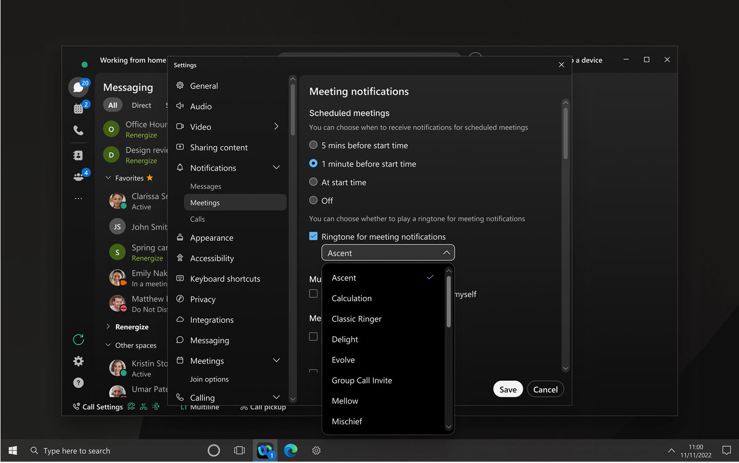 Open settings from your profile picture and click . Under Meeting actions sounds, choose the action and sound you want to hear. |