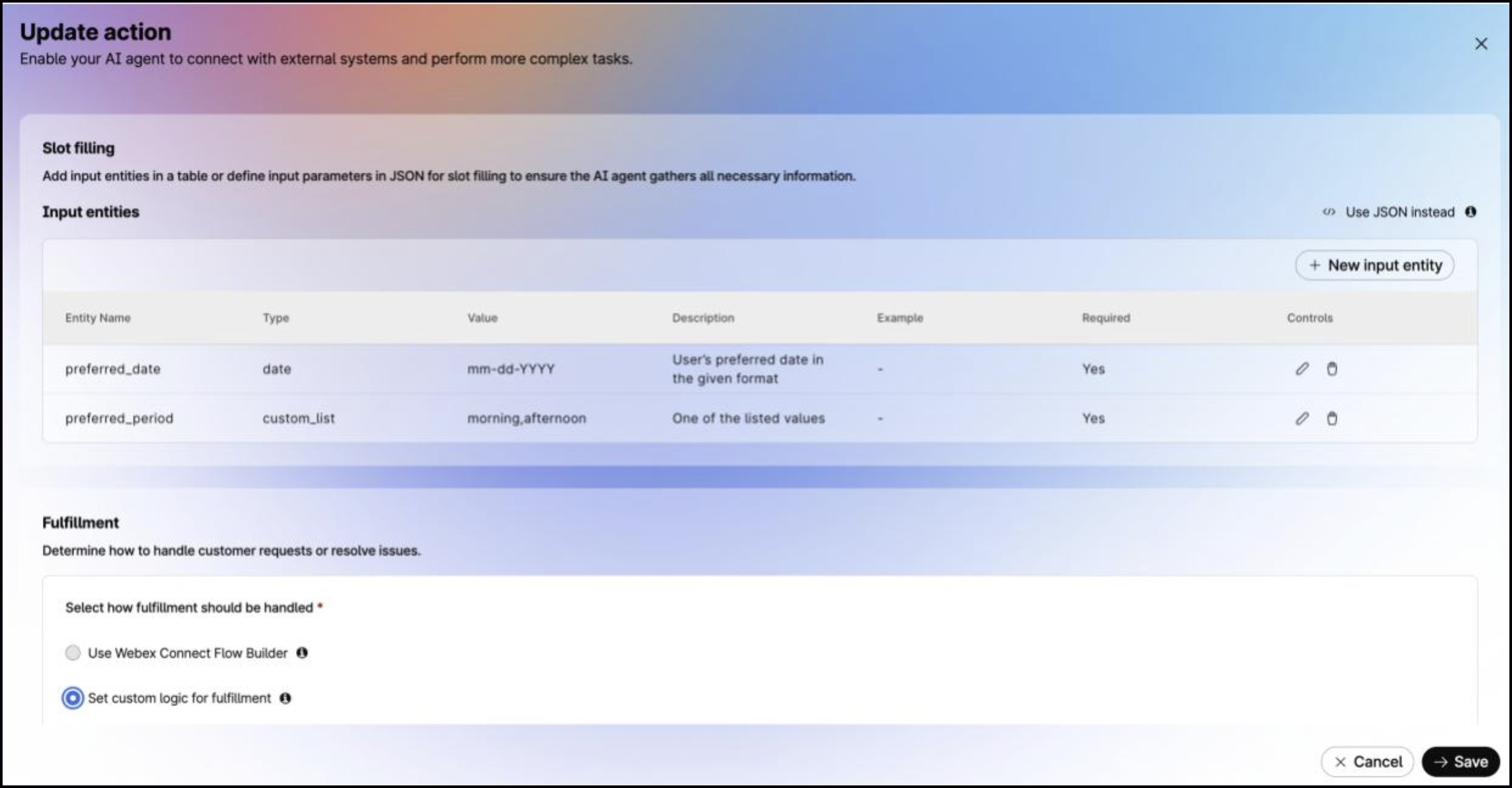 - Resume the conversation with the AI Agent by passing the fulfillment output back to the AI Agent from the flow. The fulfillment timeout limitation of Webex connect flow based fulfillment doesn't apply here.