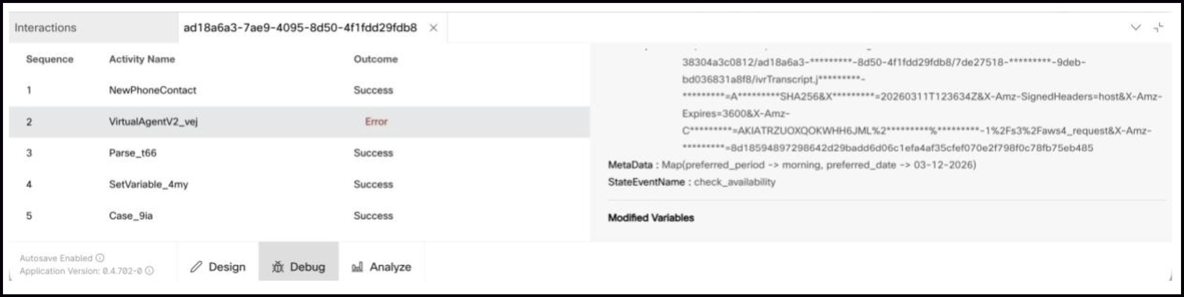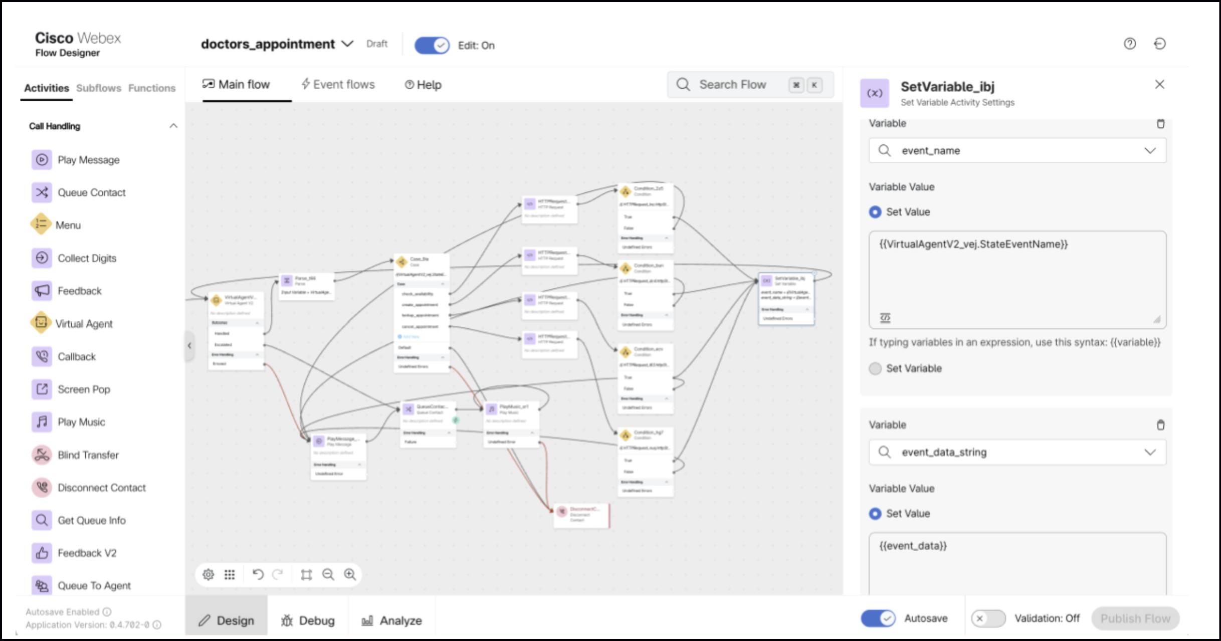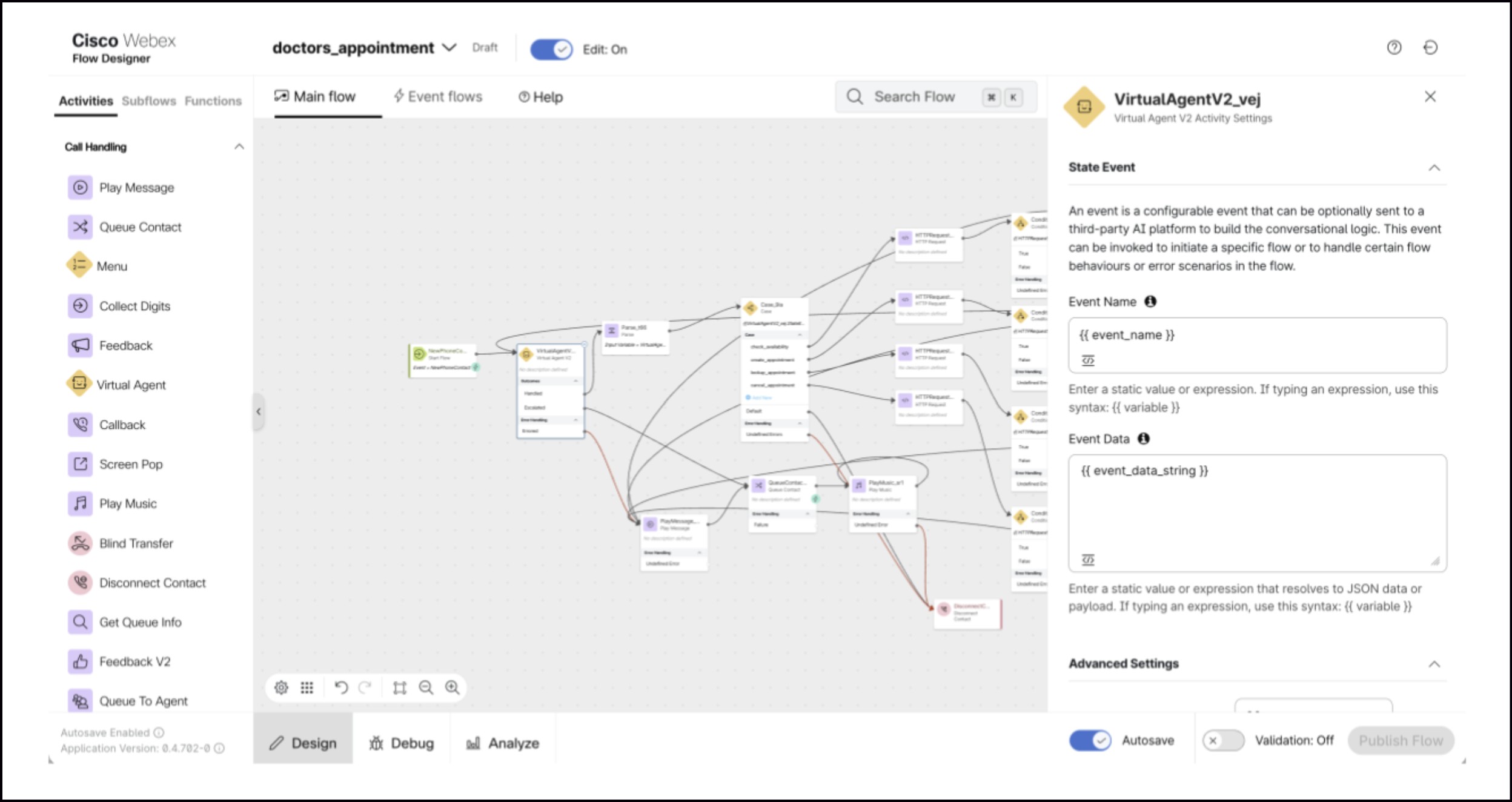 - In the Webex Contact Center Flow Designer, configure the Virtual Agent V2 activity in the flow.