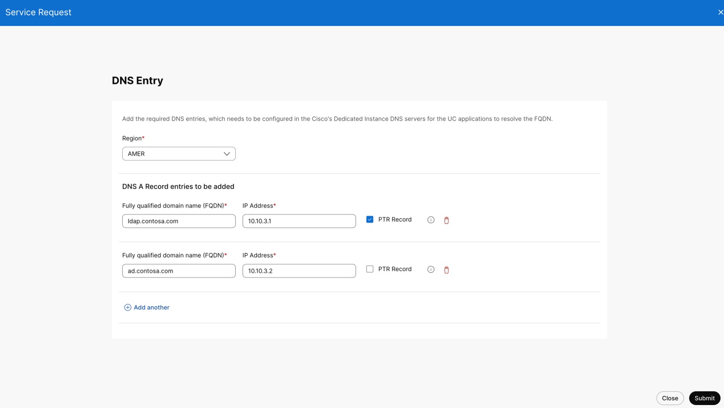 From the Region drop-down list, choose the region for which the DNS entries need to be configured. |