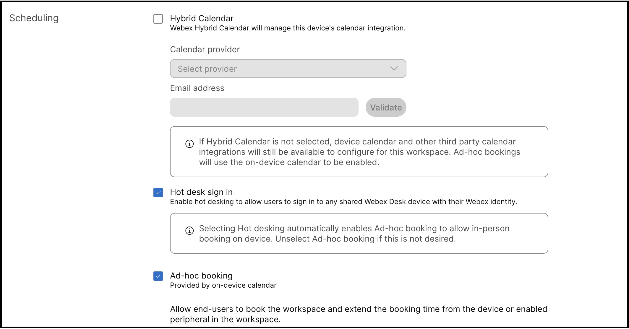 Pre-booking support for hot desking allows hot desking as a calendar feature. This allows a user to book a hot desking space before walking into the office, using a desk reservation solution such as Cisco Spaces, a third-party booking service, or the workspace hybrid calendar such as Outlook or Gmail.