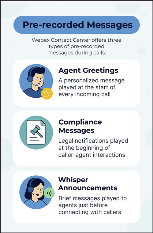 Webex Contact Center supports the following types of pre-recorded messages that are played during the beginning of the call either to the agent or to the caller, as required.
