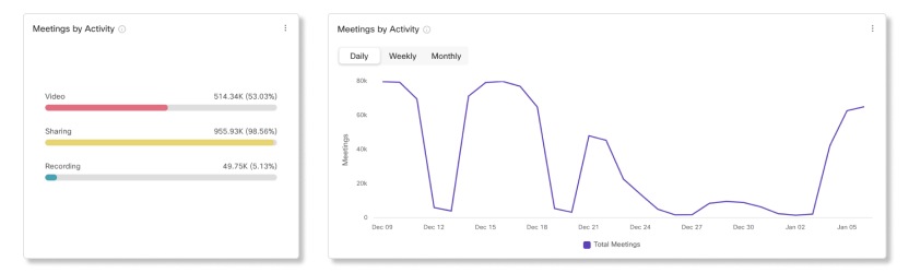 יש לך בקצות אצבעותיך תרשימים שונים הקשורים להעברת הודעות שיכולים לעזור לך לקבוע עד כמה המשתמשים שלך מעורבים ב- Webex. באפשרותך לגלות כמה אנשים בארגון שלך משתמשים באפליקציה כדי לתקשר ולשתף רעיונות, אילו מבין משתמשים אלה פעילים ביותר ואילו רווחים נמצאים בשימוש הנפוץ ביותר. אתה יכול לסמוך על המשתמשים הפעילים ביותר שלך שיעודדו אחרים בארגון שלך להשתמש באפליקציה. באפשרותך גם לקבוע את המספר והגודל של הקבצים המשותפים ואילו פלטפורמות הן הפופולריות ביותר (לדוגמה, Webex עבור Windows או Mac).