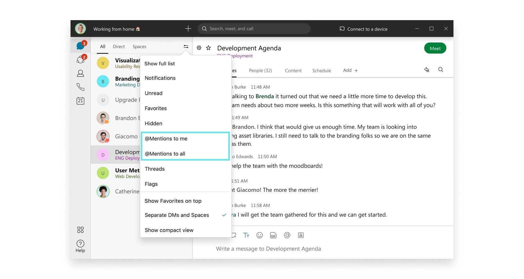 Afhankelijk van hoe uw schema eruitziet, kan het handig zijn om ongelezen berichten door te nemen in ruimten met een lagere prioriteit. Als dat betekent dat u zich door teveel ruis moet werken, kunt u snel zoeken op woorden, zinnen of personen van wie u updates wilt zien.