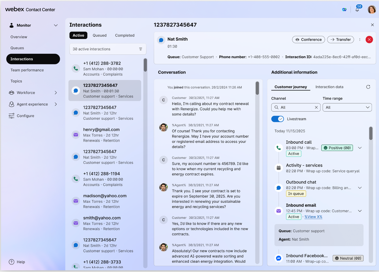 O Supervisor Desktop agora possui uma página abrangente de Detalhes de interações de página inteira, fornecendo uma exibição unificada de todas as interações com o cliente. Essa visualização aprimorada integra vários pontos de dados e tipos de mídia em uma única interface intuitiva, permitindo que os supervisores obtenham insights mais profundos sobre cada engajamento dos clientes.